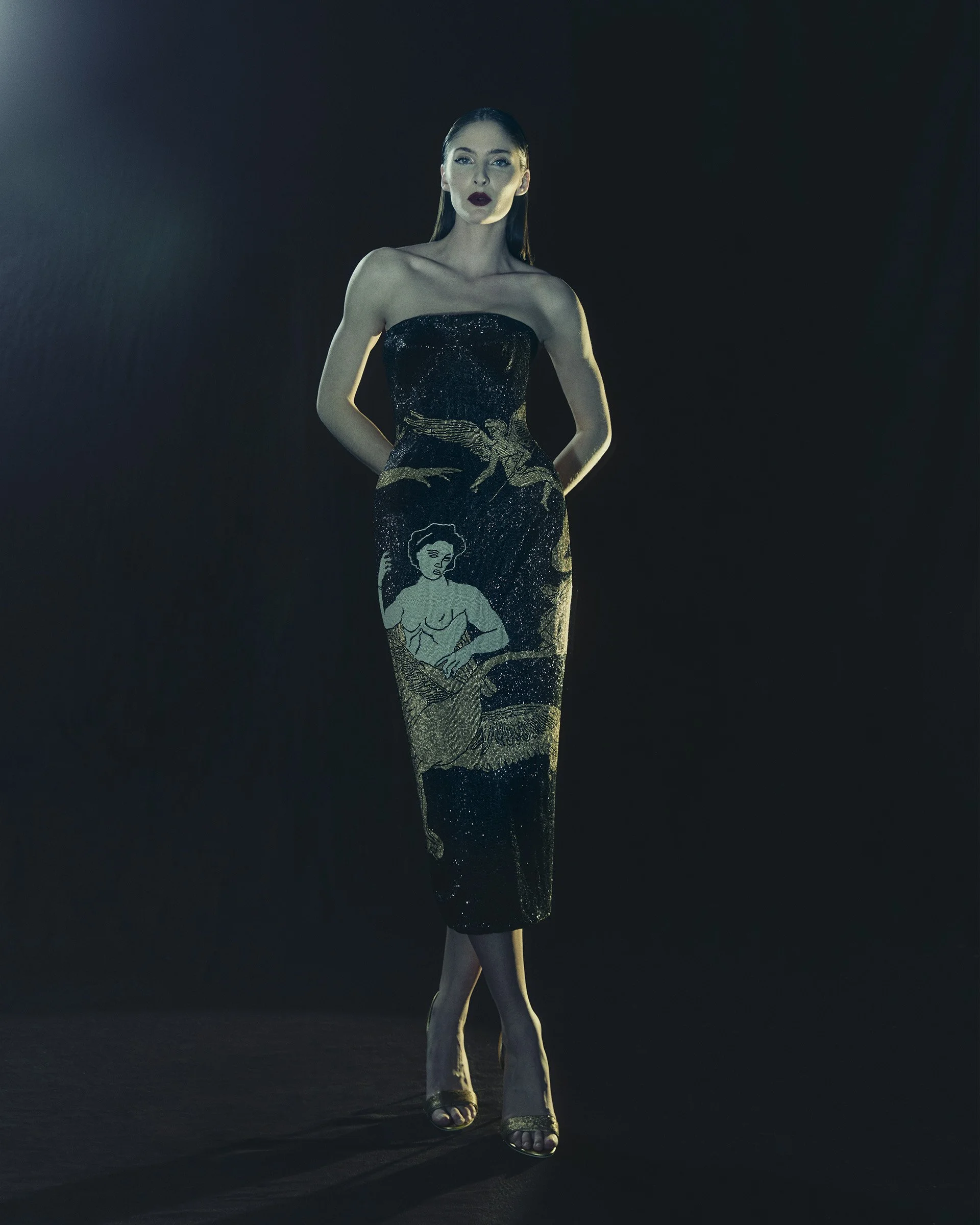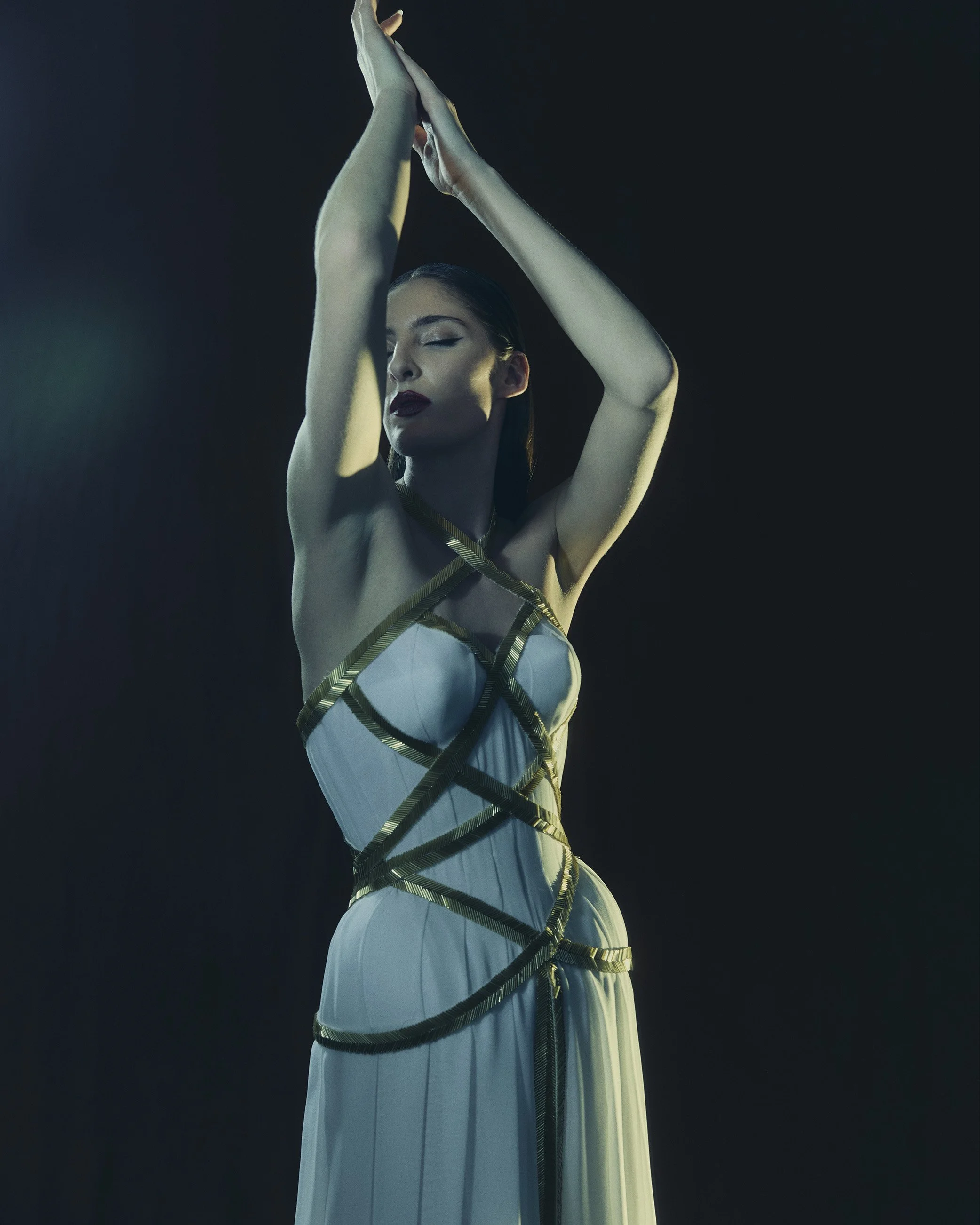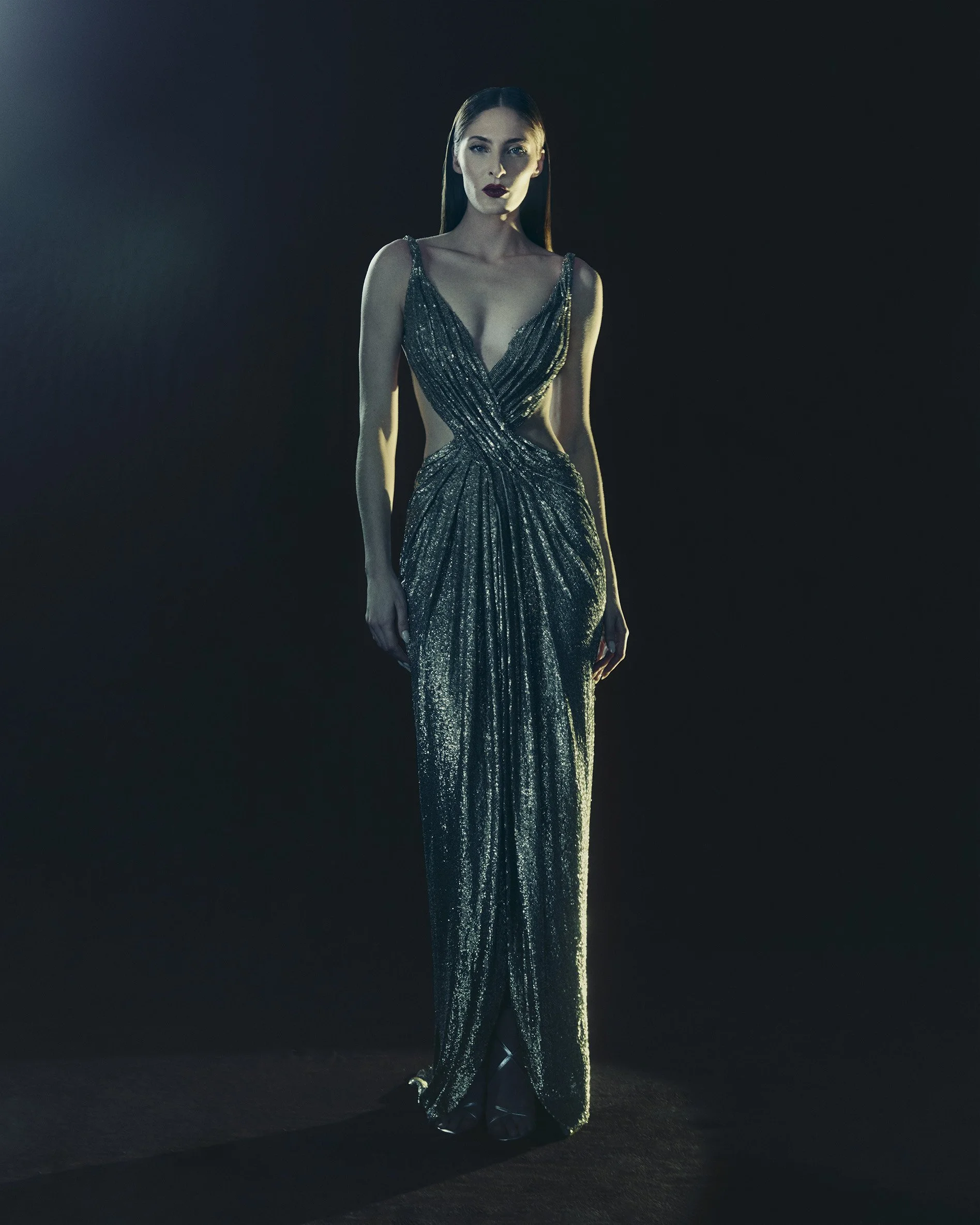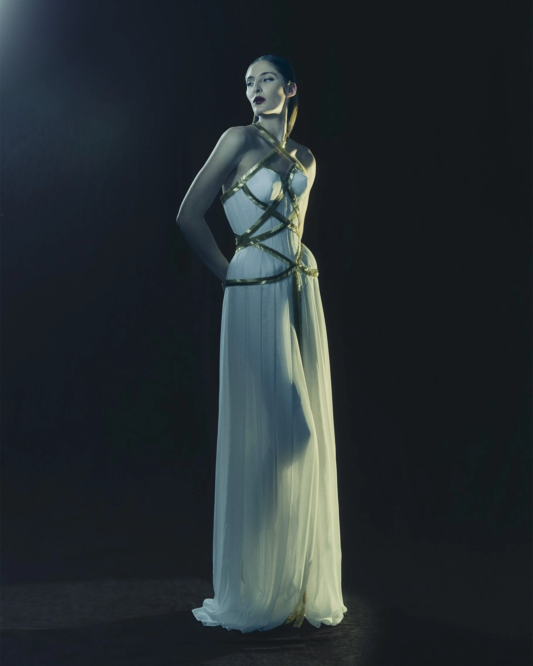 Presented as a cinematic narrative, “Goddess” bridges myth and modern couture, drawing from iconic films including Cleopatra (1963), Julius Caesar (1953), The Ten Commandments (1956), Land of the Pharaohs (1955), and The Egyptian (1954), with a nod to the era’s legendary costume makers such as Charles Le Maire. Draped gowns suggest Grecian divinity; architectural tailoring hints at Roman power; corsetry and sweeping capes deliver pure screen drama.