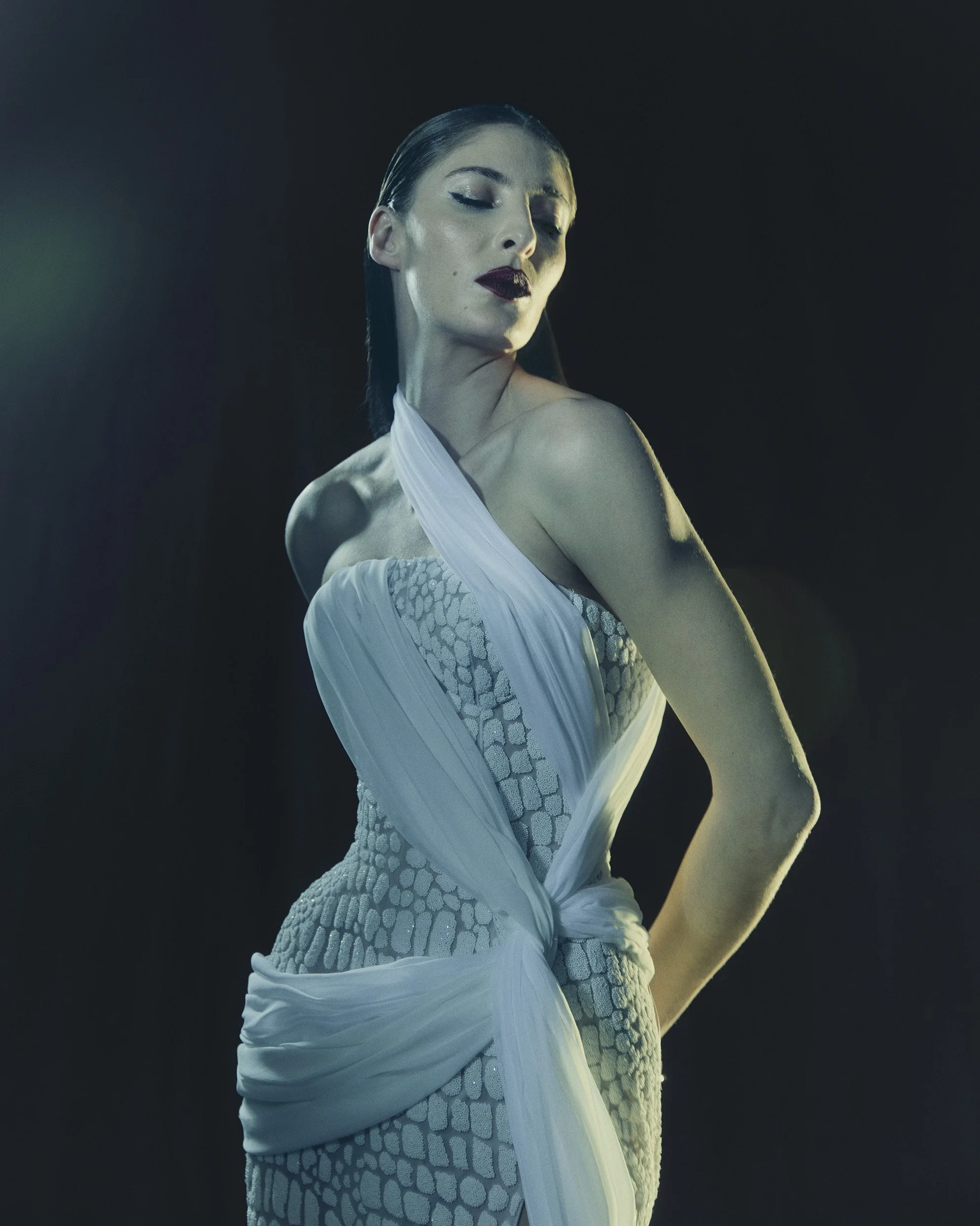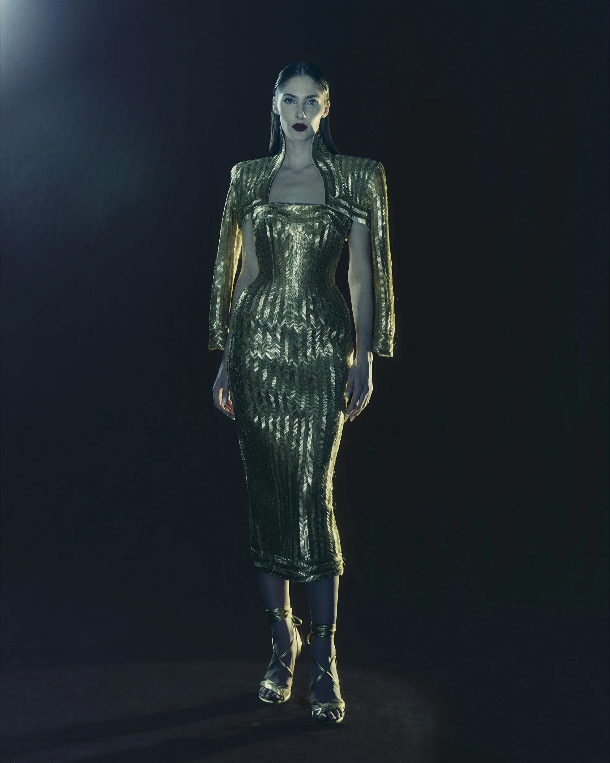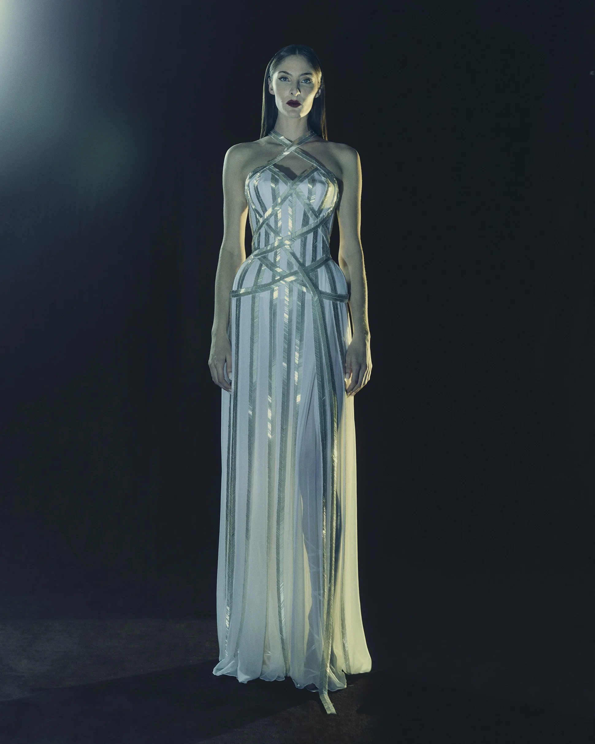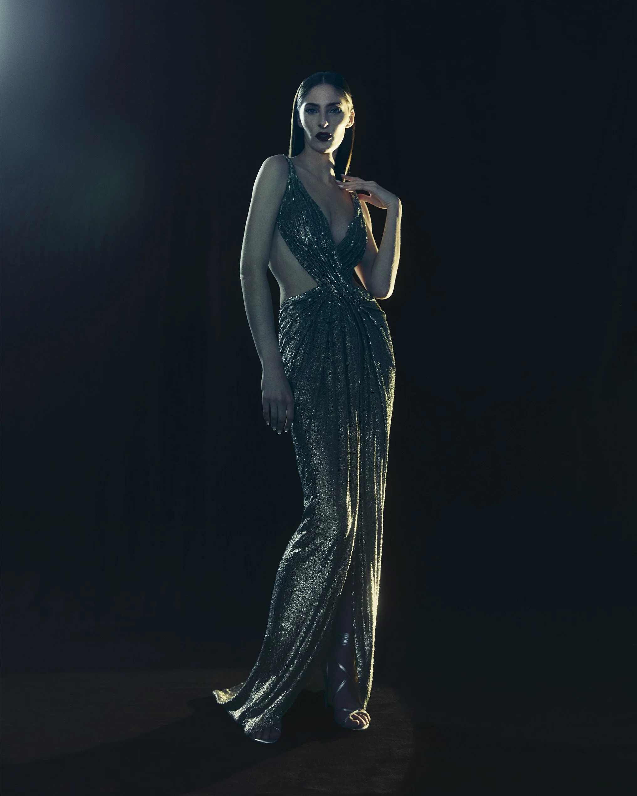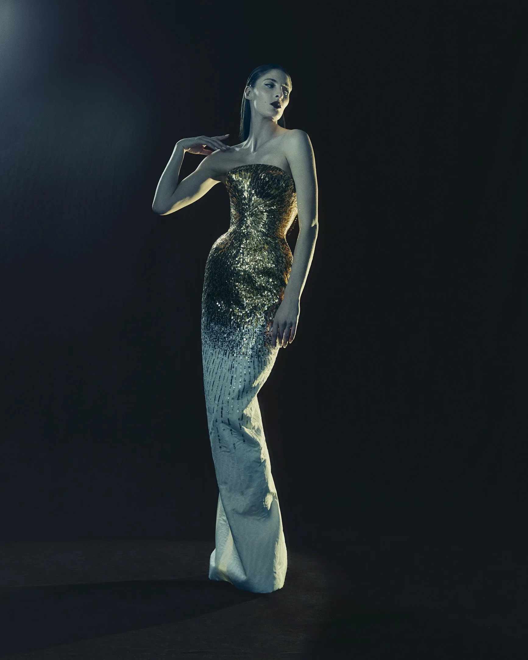 Presented as a cinematic narrative, “Goddess” bridges myth and modern couture, drawing from iconic films including Cleopatra (1963), Julius Caesar (1953), The Ten Commandments (1956), Land of the Pharaohs (1955), and The Egyptian (1954), with a nod to the era’s legendary costume makers such as Charles Le Maire. Draped gowns suggest Grecian divinity; architectural tailoring hints at Roman power; corsetry and sweeping capes deliver pure screen drama.