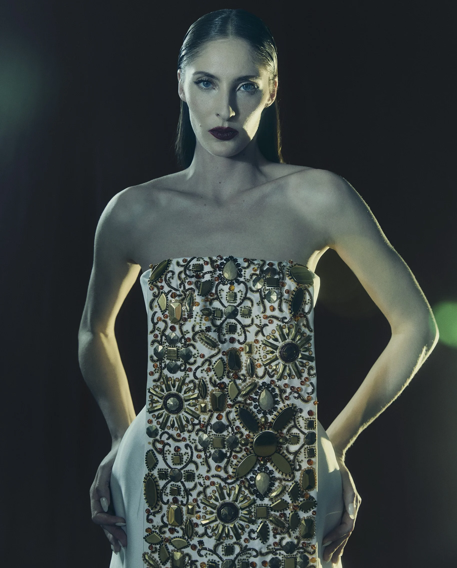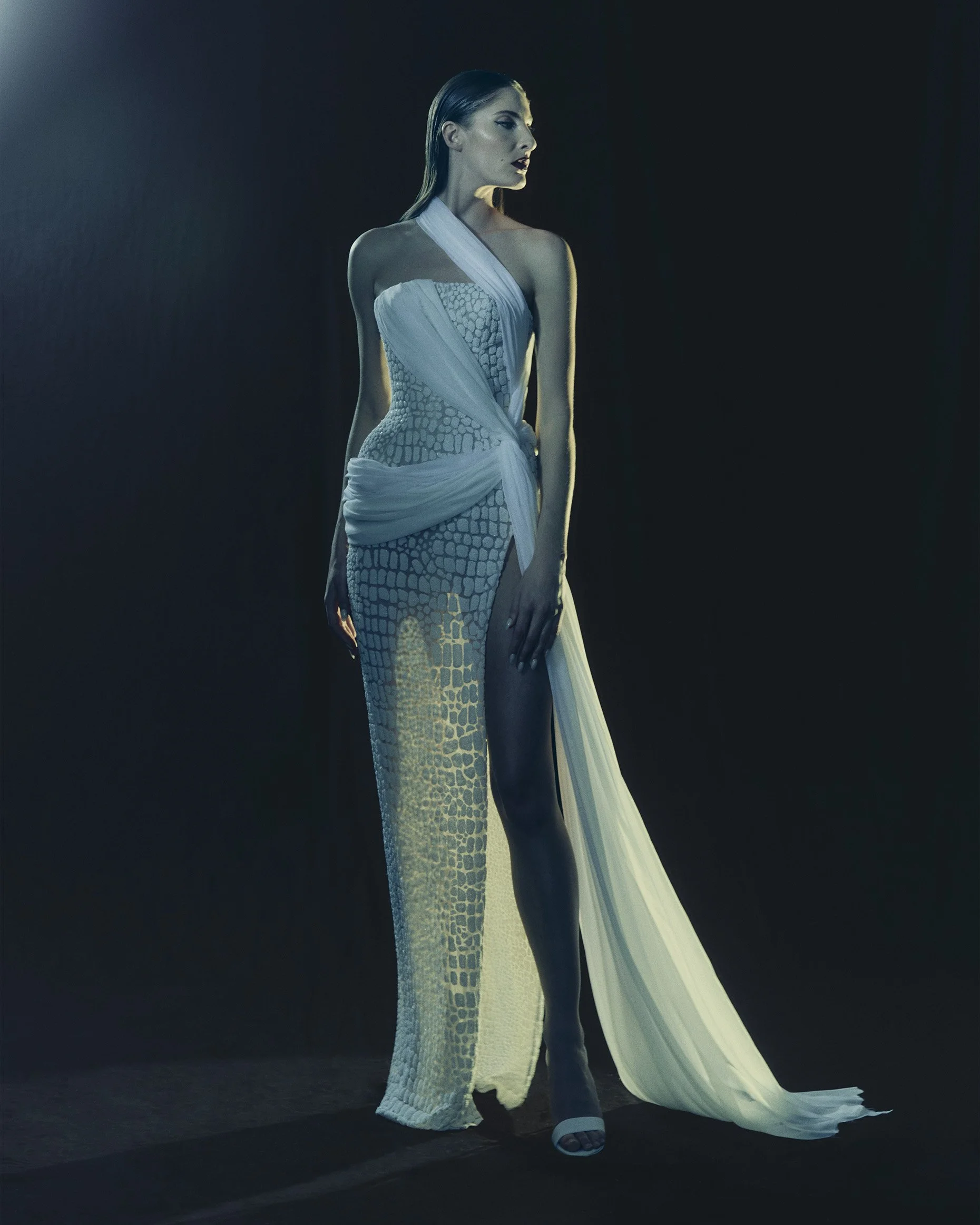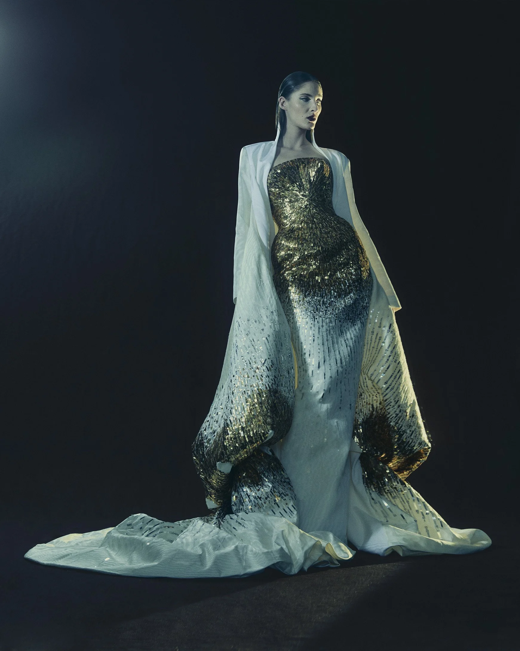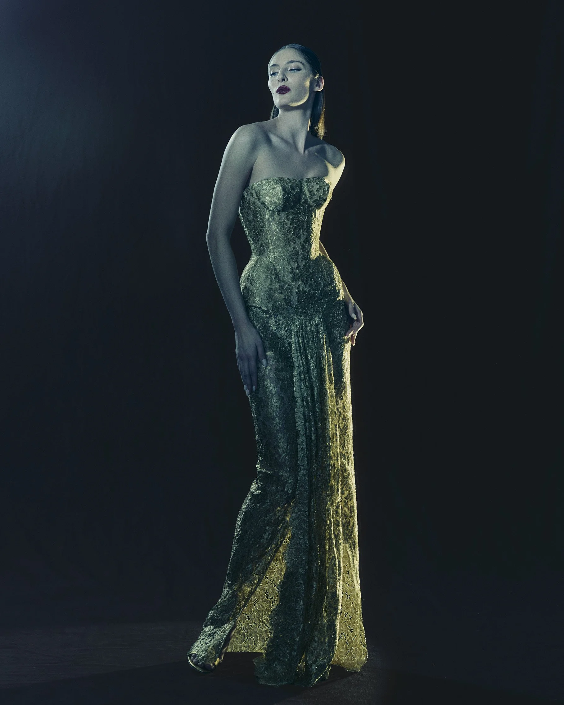 Presented as a cinematic narrative, “Goddess” bridges myth and modern couture, drawing from iconic films including Cleopatra (1963), Julius Caesar (1953), The Ten Commandments (1956), Land of the Pharaohs (1955), and The Egyptian (1954), with a nod to the era’s legendary costume makers such as Charles Le Maire. Draped gowns suggest Grecian divinity; architectural tailoring hints at Roman power; corsetry and sweeping capes deliver pure screen drama.