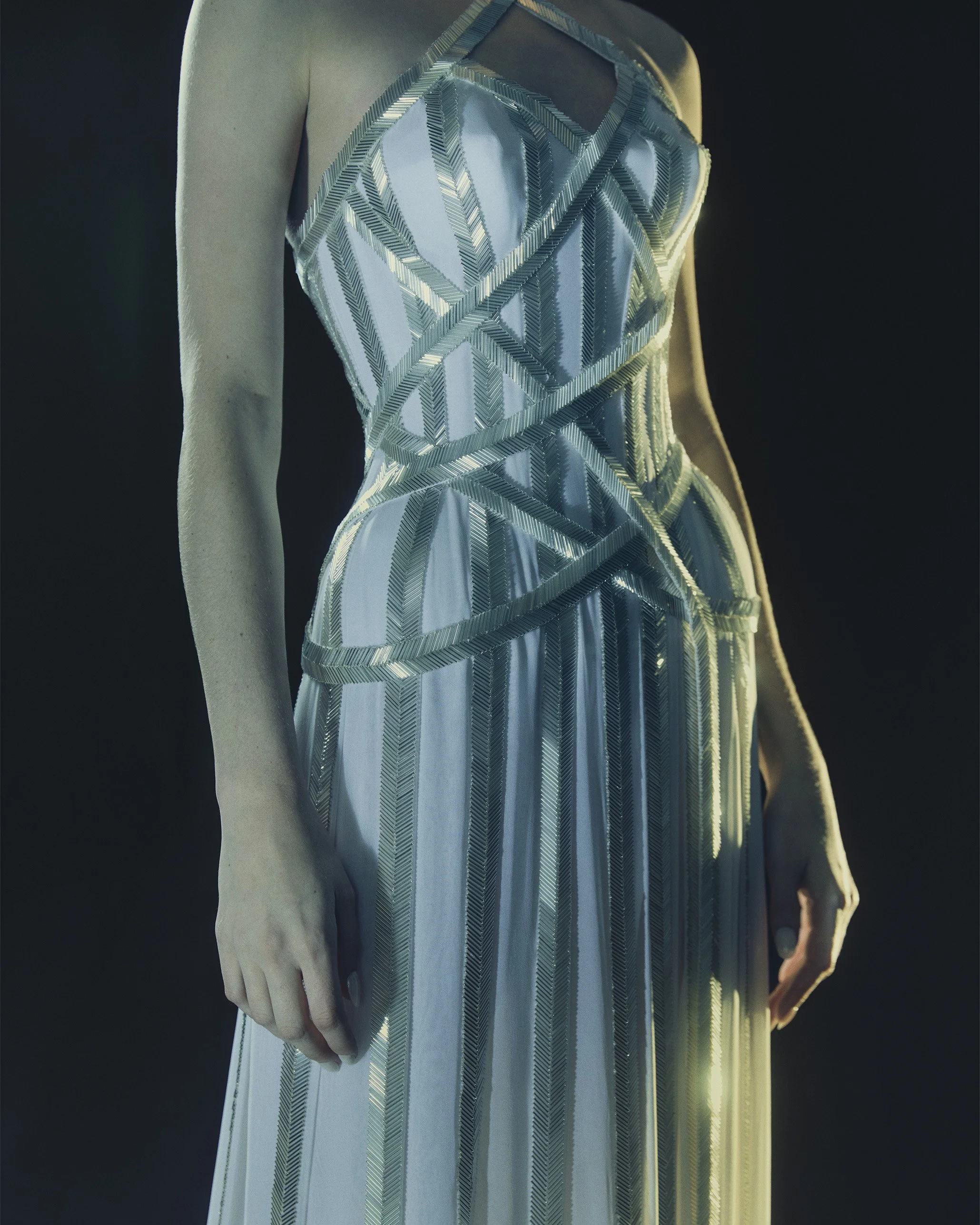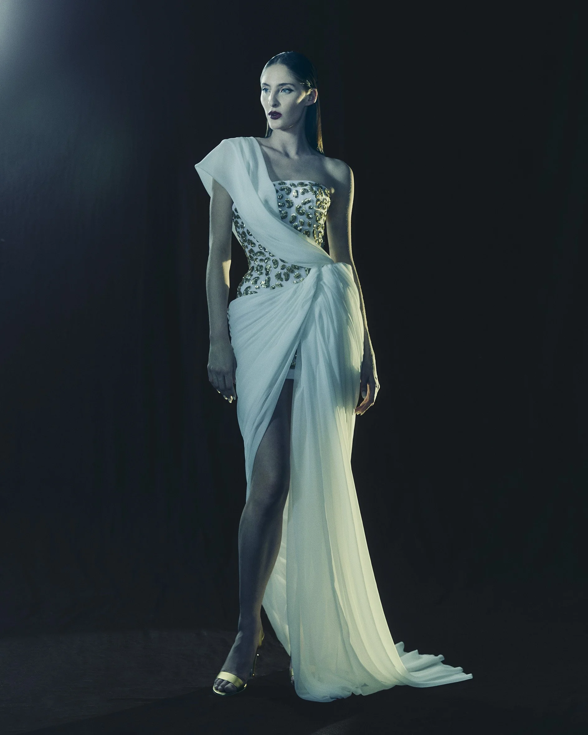 Gold accents, metallic embroidery, and frieze-inspired motifs shimmer across a palette of ivory, white, gold, silver, bronze, soft pink, and desert sands. Anchored in meticulous handwork — from georgette and moiré to taffeta, chiffon, and ornate embroidery — “Goddess” is designed for a modern woman who embraces elegance, spectacle, and timeless grandeur.