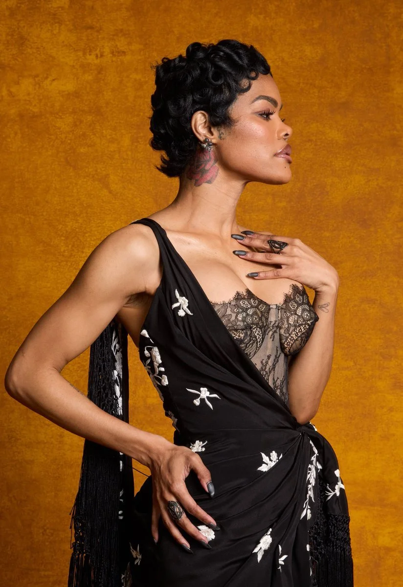 Teyana Taylor stepped onto the Critics’ Choice Association red carpet in a spectacular Nicholas Oakwell Couture gown that became one of the evening’s defining moments. Inspired by the Waldorf Astoria collection’s muse Millicent Hearst, the look reimagines half-dressing with modern sensuality, pairing a hand-embroidered Spanish shawl with a sculpted lace corset to striking effect. Taylor embodied the collection’s narrative of effortless glamour and provocative elegance—captivating guests and press alike.